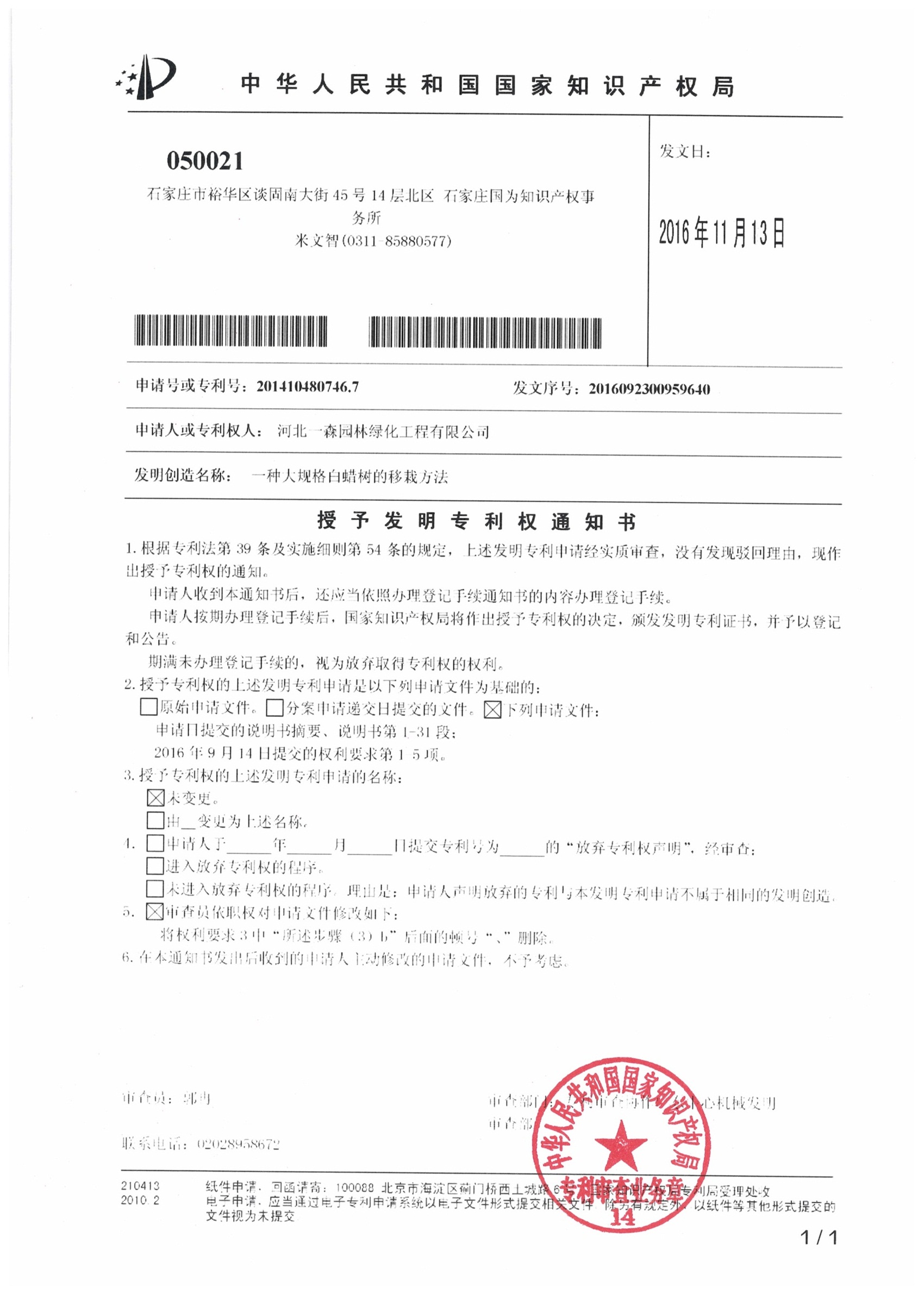 2016年11月13日,河北一森園林綠化工程股份有限公司收到國家知識產權局關于一森園林“一種大規格白蠟樹的移栽方法”被授予發明專利的通知,專利號201410480746.7。本發明專利涉及樹木的移栽技術領域,移栽成活率高,投資少,簡單易行,效果好,效益高。在園林綠化工程中作用突出,好掌控,效果顯著。河北一森園林已建成全國最大的大規格白蠟基地,在本發明專利方法的指導下,大規格白蠟的移栽成活率高達95%。