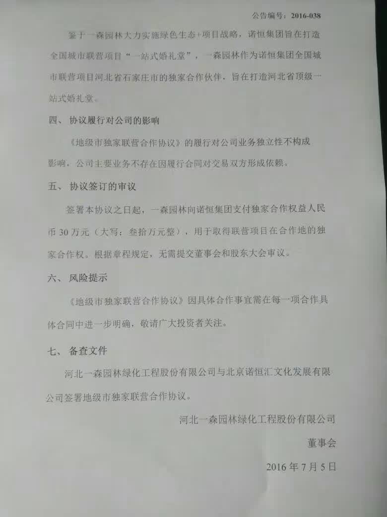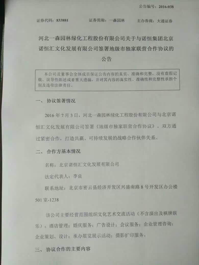 河北一森園林綠化工程股份有限公司關于與諾恒集團北京諾恒匯文化發展有限公司簽署地級市獨家聯營合作協議公告